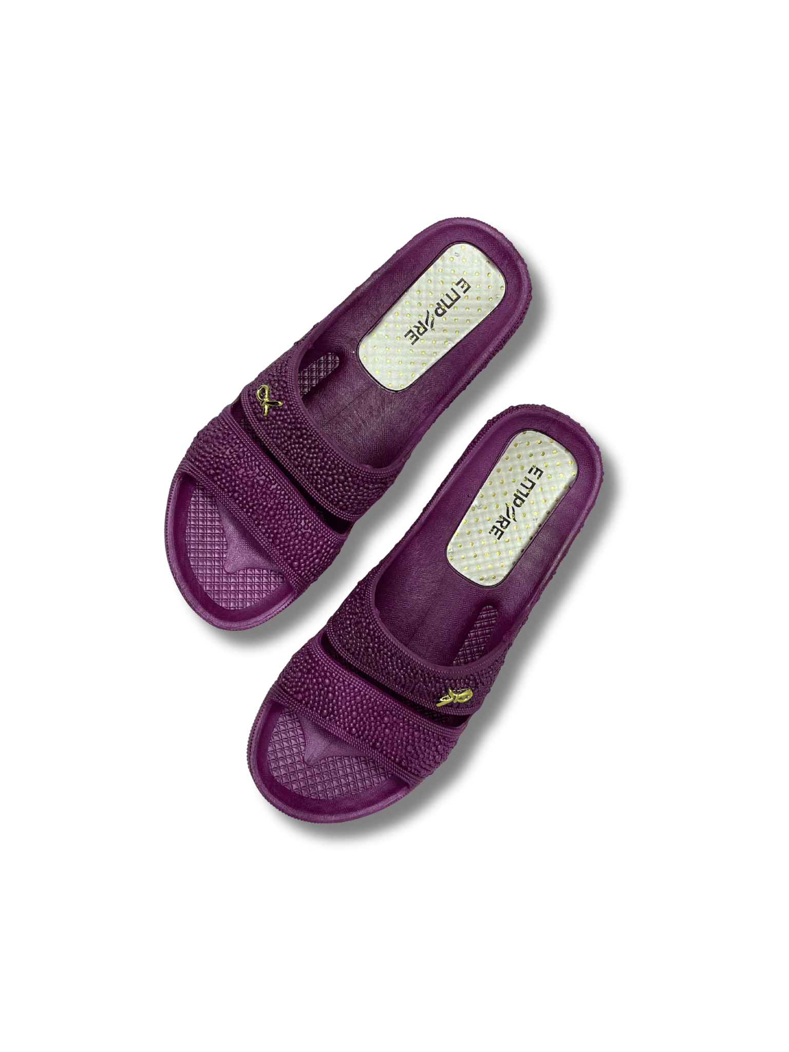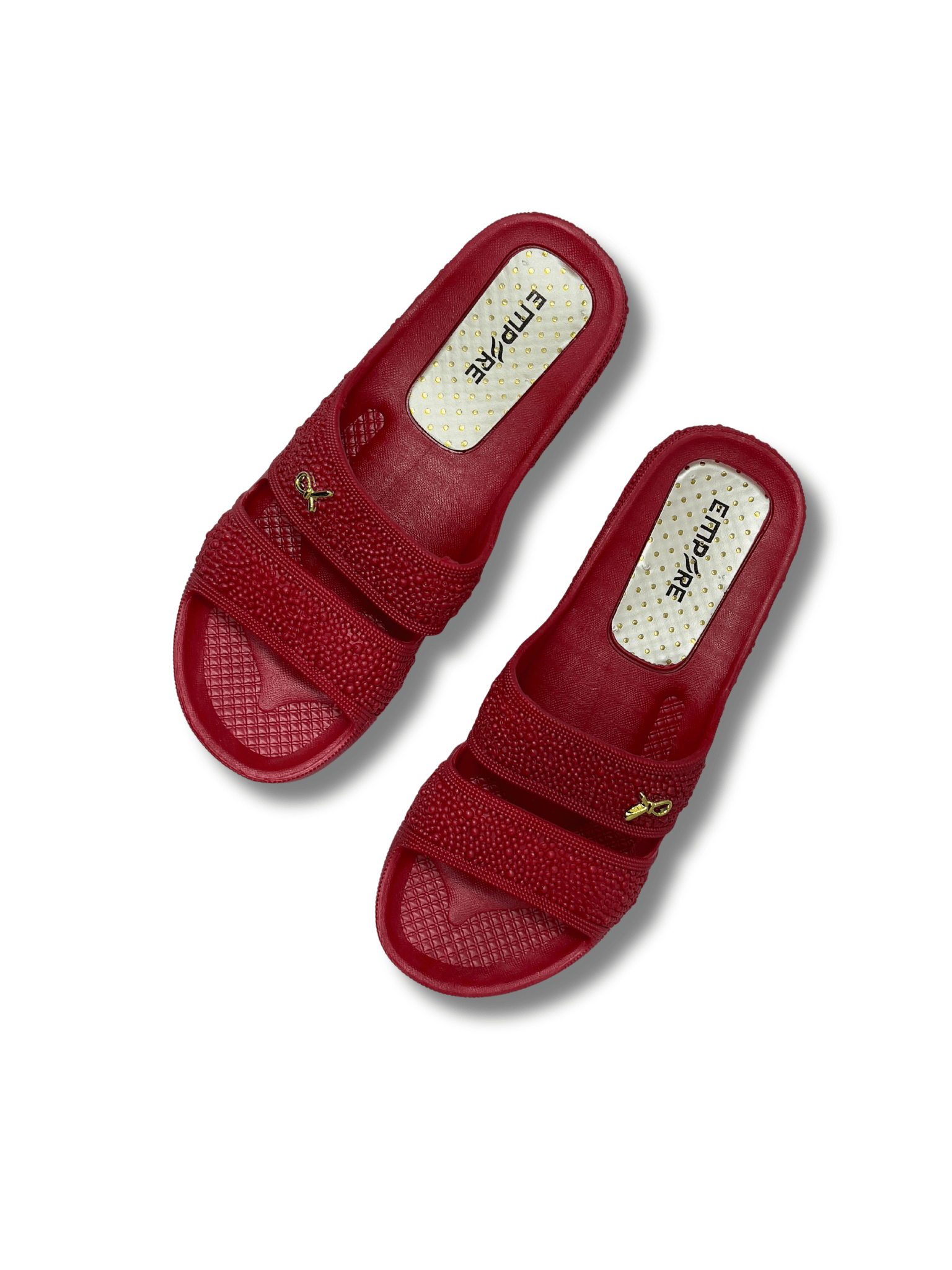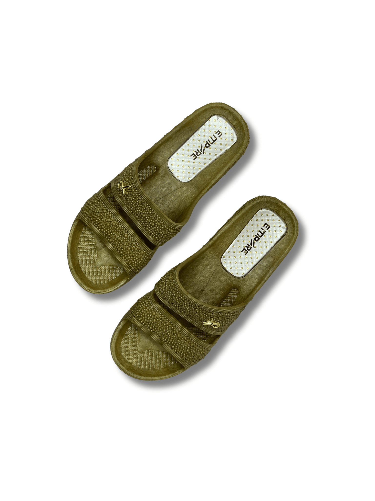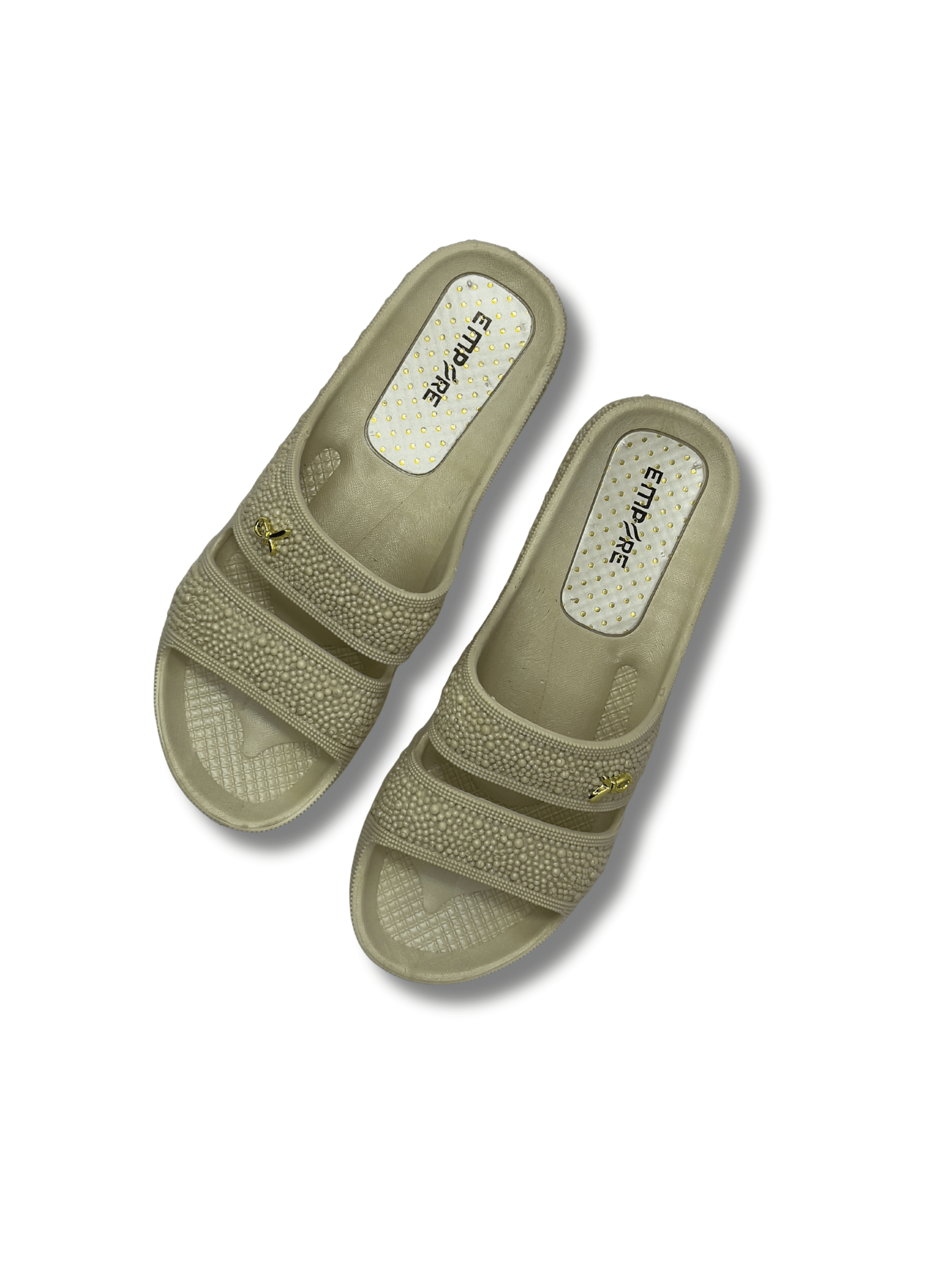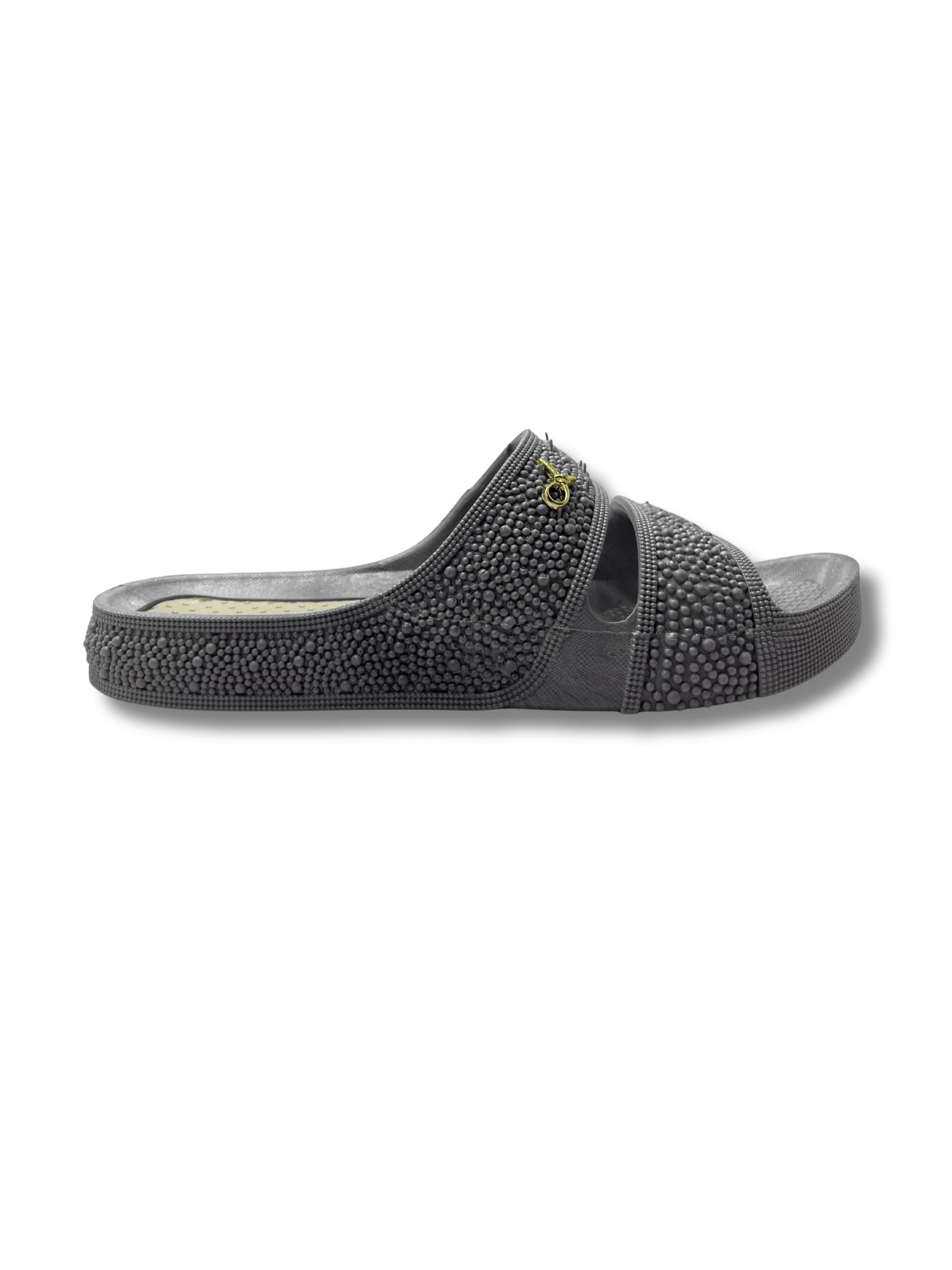 The Honeycomb Comfort Slides bring together style, durability, and a softer PCU build for all-day wear. Unlike traditional hard plastic slides, these feature a more comfortable, slightly cushioned PCU material that offers better flexibility while staying sturdy for long-lasting use. The straps showcase a textured honeycomb bead pattern, paired with a small gold ribbon-shaped jewel for a touch of elegance.